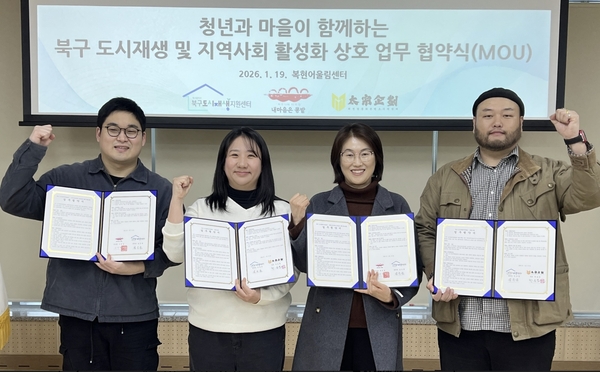 <p><span style="color: rgb(34, 34, 34); font-family: "Malgun Gothic", 돋움, dotum, Helvetica, "Apple SD Gothic Neo", sans-serif; font-size: 16px; background-color: rgb(255, 255, 255);">대구 북구 도시재생지원센터가 청년 조직과 손잡고 지역공동체 기반 도시재생에 본격 나선다고 20일 밝혔다.</span><br style="box-sizing: inherit; color: rgb(34, 34, 34); font-family: "Malgun Gothic", 돋움, dotum, Helvetica, "Apple SD Gothic Neo", sans-serif; font-size: 16px; background-color: rgb(255, 255, 255);"><br style="box-sizing: inherit; color: rgb(34, 34, 34); font-family: "Malgun Gothic", 돋움, dotum, Helvetica, "Apple SD Gothic Neo", sans-serif; font-size: 16px; background-color: rgb(255, 255, 255);"><span style="color: rgb(34, 34, 34); font-family: "Malgun Gothic", 돋움, dotum, Helvetica, "Apple SD Gothic Neo", sans-serif; font-size: 16px; background-color: rgb(255, 255, 255);">대구 북구 도시재생지원센터는 지난 19일 복현어울림센터에서 내마음은 콩밭 협동조합, 태종기획과 함께 지역사회 활성화와 도시재생 사업의 실질적 성과 창출을 위한 3자 업무협약을 체결했다.</span><br style="box-sizing: inherit; color: rgb(34, 34, 34); font-family: "Malgun Gothic", 돋움, dotum, Helvetica, "Apple SD Gothic Neo", sans-serif; font-size: 16px; background-color: rgb(255, 255, 255);"><br style="box-sizing: inherit; color: rgb(34, 34, 34); font-family: "Malgun Gothic", 돋움, dotum, Helvetica, "Apple SD Gothic Neo", sans-serif; font-size: 16px; background-color: rgb(255, 255, 255);"><span style="color: rgb(34, 34, 34); font-family: "Malgun Gothic", 돋움, dotum, Helvetica, "Apple SD Gothic Neo", sans-serif; font-size: 16px; background-color: rgb(255, 255, 255);">이번 협약은 도시재생 현장에 청년의 기획력과 커뮤니티 디자인 역량을 결합해, 청년과 주민이 함께 참여하는 지속 가능한 지역공동체 모델을 구축하는 데 초점을 맞췄다. 단순한 공간 정비를 넘어 사람 중심의 도시재생을 실현하겠다는 구상이다.</span><br style="box-sizing: inherit; color: rgb(34, 34, 34); font-family: "Malgun Gothic", 돋움, dotum, Helvetica, "Apple SD Gothic Neo", sans-serif; font-size: 16px; background-color: rgb(255, 255, 255);"><br style="box-sizing: inherit; color: rgb(34, 34, 34); font-family: "Malgun Gothic", 돋움, dotum, Helvetica, "Apple SD Gothic Neo", sans-serif; font-size: 16px; background-color: rgb(255, 255, 255);"><span style="color: rgb(34, 34, 34); font-family: "Malgun Gothic", 돋움, dotum, Helvetica, "Apple SD Gothic Neo", sans-serif; font-size: 16px; background-color: rgb(255, 255, 255);">협약에 따라 세 기관은 북구 도시재생사업과 연계한 커뮤니티 활성화 프로그램을 공동으로 기획·운영하고, 청년과 대학생의 지역 참여를 확대하기 위한 문화 프로그램과 역량 강화 활동을 추진한다. 또한 청년과 주민이 함께 참여하는 주민 주도형 도시재생 프로젝트와 현장지원, 주민 교육·컨설팅 사업도 협력해 진행할 계획이다.</span><br style="box-sizing: inherit; color: rgb(34, 34, 34); font-family: "Malgun Gothic", 돋움, dotum, Helvetica, "Apple SD Gothic Neo", sans-serif; font-size: 16px; background-color: rgb(255, 255, 255);"><br style="box-sizing: inherit; color: rgb(34, 34, 34); font-family: "Malgun Gothic", 돋움, dotum, Helvetica, "Apple SD Gothic Neo", sans-serif; font-size: 16px; background-color: rgb(255, 255, 255);"><span style="color: rgb(34, 34, 34); font-family: "Malgun Gothic", 돋움, dotum, Helvetica, "Apple SD Gothic Neo", sans-serif; font-size: 16px; background-color: rgb(255, 255, 255);">특히 이번 협력은 청년의 창의적 기획이 마을의 일상 속으로 스며드는 구조를 만드는 데 의미가 있다. 청년에게는 지역에서 실질적인 활동 무대를 제공하고, 마을에는 새로운 활력을 불어넣는 상생 모델로 평가된다.</span><br style="box-sizing: inherit; color: rgb(34, 34, 34); font-family: "Malgun Gothic", 돋움, dotum, Helvetica, "Apple SD Gothic Neo", sans-serif; font-size: 16px; background-color: rgb(255, 255, 255);"><br style="box-sizing: inherit; color: rgb(34, 34, 34); font-family: "Malgun Gothic", 돋움, dotum, Helvetica, "Apple SD Gothic Neo", sans-serif; font-size: 16px; background-color: rgb(255, 255, 255);"><span style="color: rgb(34, 34, 34); font-family: "Malgun Gothic", 돋움, dotum, Helvetica, "Apple SD Gothic Neo", sans-serif; font-size: 16px; background-color: rgb(255, 255, 255);">김은윤 북구 도시재생지원센터장은 “청년과 주민이 함께 지역 문제를 고민하고 해결하는 과정을 도시재생 현장에서 실천해 나가겠다”며 “사람 중심의 도시재생이 북구에 안정적으로 정착될 수 있도록 적극 지원하겠다”고 말했다.</span><br style="box-sizing: inherit; color: rgb(34, 34, 34); font-family: "Malgun Gothic", 돋움, dotum, Helvetica, "Apple SD Gothic Neo", sans-serif; font-size: 16px; background-color: rgb(255, 255, 255);"><br style="box-sizing: inherit; color: rgb(34, 34, 34); font-family: "Malgun Gothic", 돋움, dotum, Helvetica, "Apple SD Gothic Neo", sans-serif; font-size: 16px; background-color: rgb(255, 255, 255);"><span style="color: rgb(34, 34, 34); font-family: "Malgun Gothic", 돋움, dotum, Helvetica, "Apple SD Gothic Neo", sans-serif; font-size: 16px; background-color: rgb(255, 255, 255);">배광식 북구청장은 “도시재생 뉴딜사업으로 다져진 기반 위에 청년들의 기획력과 주민들의 공동체 경험이 더해지면 지역 활성화의 동력이 될 것”이라며 “이번 협약이 북구 도시재생의 새로운 전환점이 되길 기대한다”고 밝혔다.</span> </p>
